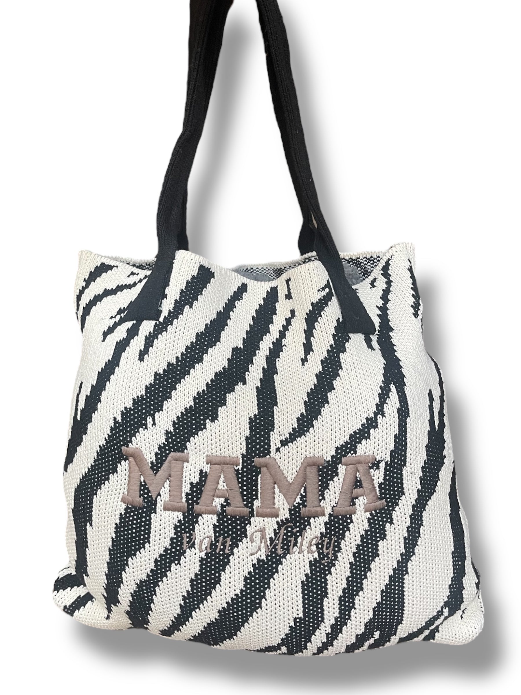 De tas is voorzien van een opvallende zwart-witte zebra print en een zachte geborduurde tekst: “MAMA van [naam]”, volledig personaliseerbaar naar jouw wens. Superleuk als cadeau voor een (aanstaande) mama of gewoon voor jezelf.